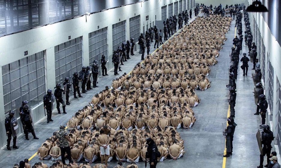 This image from 2023 shows detainees at CECOT. It was widely circulated at the time, suggesting that the U.S. Government was aware of the conditions into which it was sending people in 2025. Reproduced from The Guardian, Getty Images.