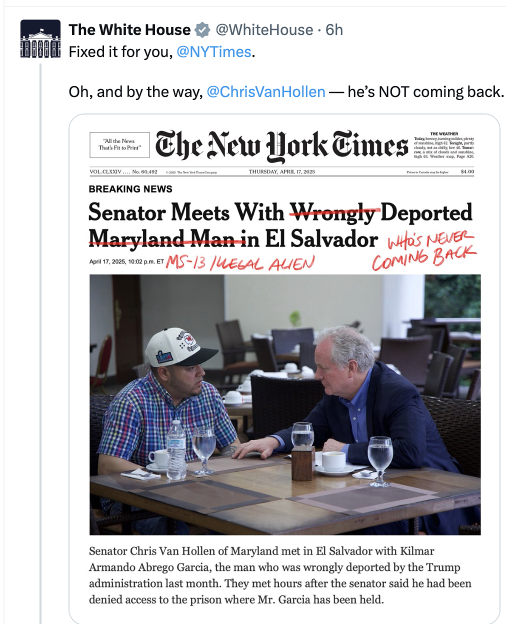 The focus here is on the U.S. Government response. When the meeting was reported by the New York Times, the official “The White House” site posted on X, correcting the language of their headline. By the time of that meeting, there was a Supreme Court order that the U.S. Government “facilitate” his release, as well as orders by the federal court and the Fourth Circuit, some of which is posted above.
